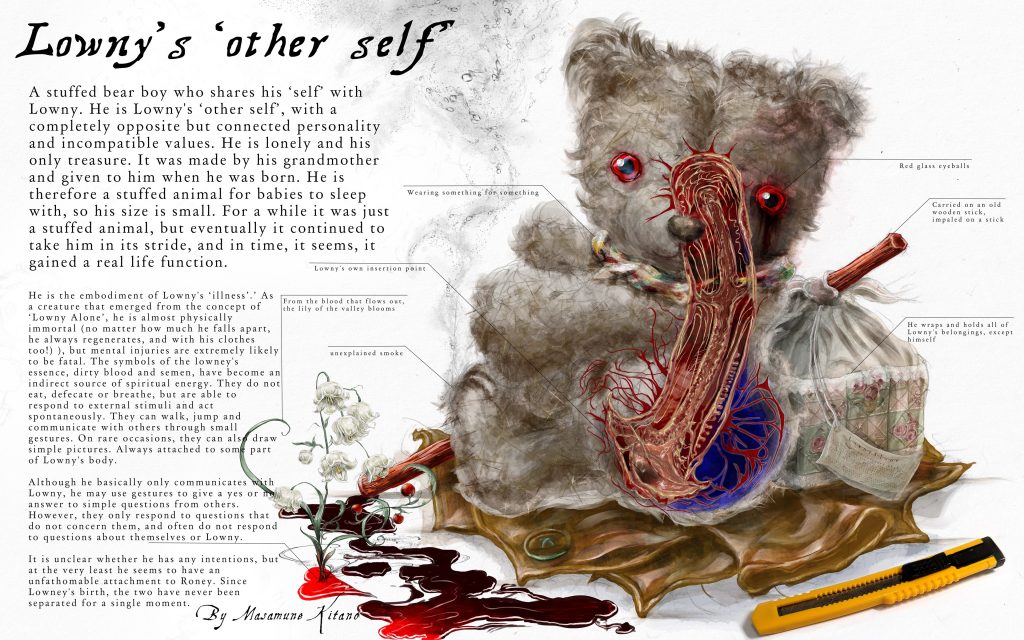 ローニーから”自分”を分け与えられた、ぬいぐるみのクマの男の子。まったく正反対だが地続きの性格、相容れない価値観を持った、ローニーにとっての”もうひとりの自分”である。孤独な彼の、唯一の宝物。ボウタイとサスペンダーを着用しているおしゃれさん。彼のおばあちゃんに作られたもので、彼が生まれたときにプレゼントされた。したがって赤子の添い寝用のぬいぐるみなので、サイズは小さい。しばらくはただのぬいぐるみだったが、やがて彼のことを一身に受け止め続けることになり、そのうちに、現実に生命機能を得てしまったらしい。